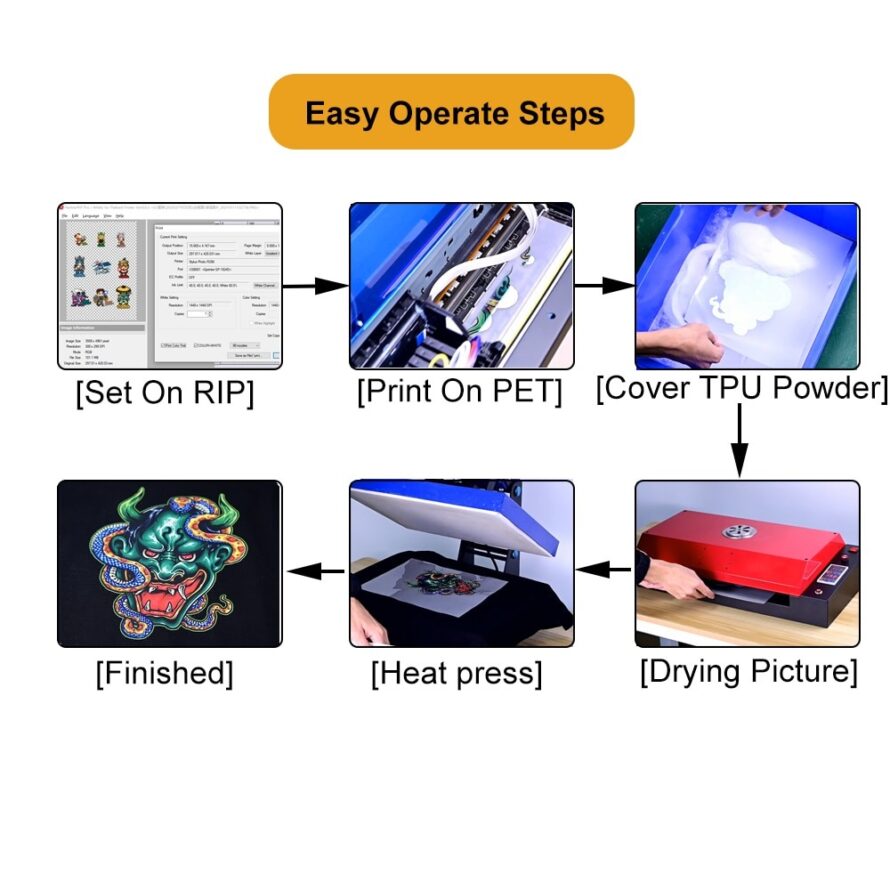 DTF Ink, PET film, hot melt adhesive powder, heat press not included.